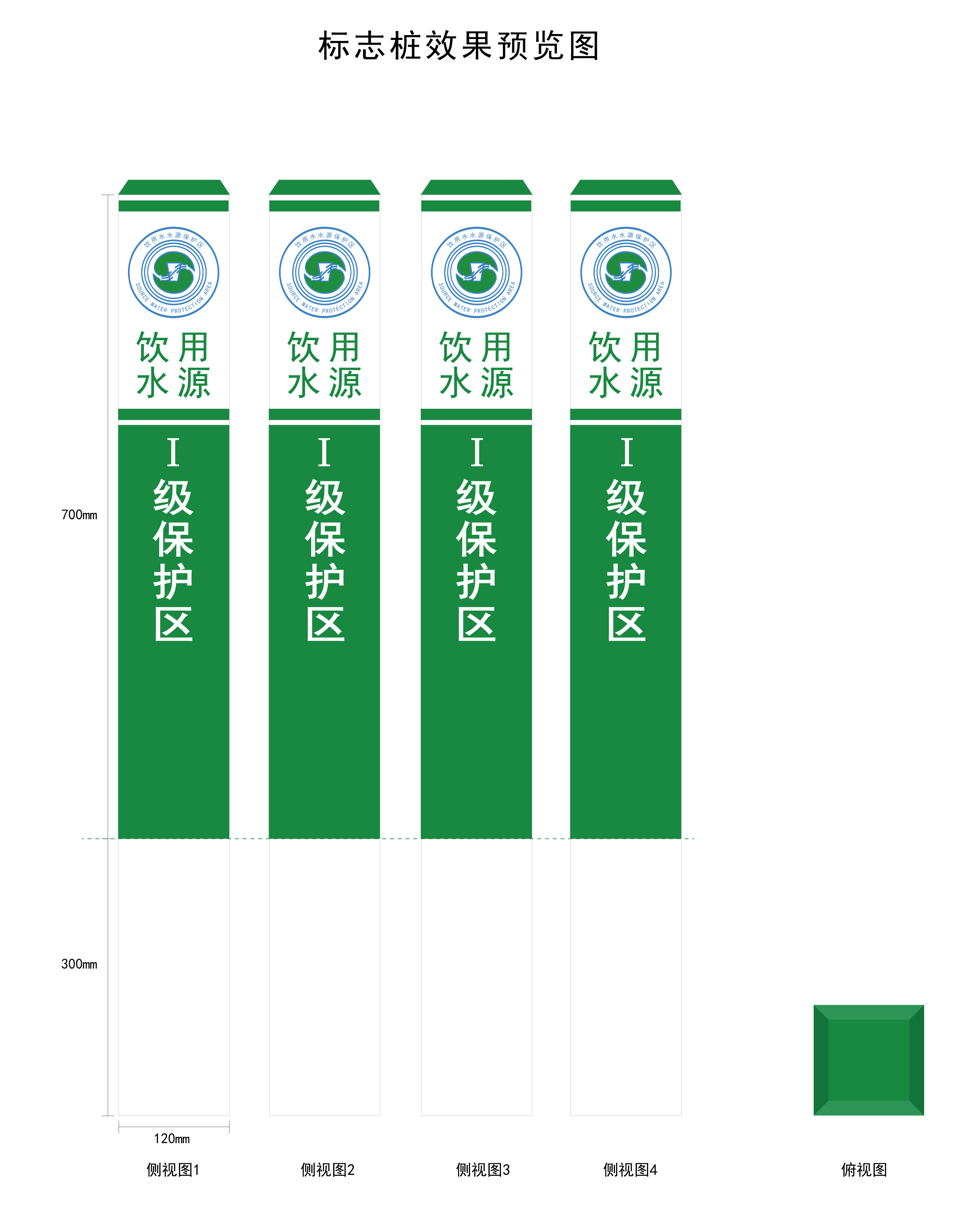 1、漸變色LOGO。2、樁體呈白綠色,印字加飲用水源保護(hù)區(qū)、電話信息等。