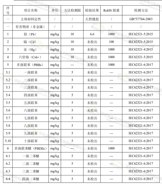 以上就是絕緣橡膠板成份檢測的事項了,通過檢測報表可以看出金能絕緣膠墊主材料為原生橡膠材質(zhì),鎘、汞、六價鉻、溴聯(lián)苯、多溴聯(lián)苯醚、溴二苯醚等有害物質(zhì)均沒有檢測出,證明金能電力絕緣膠墊是由原生橡膠制作,不含有害物質(zhì)的產(chǎn)品,是環(huán)保、質(zhì)量為一體的高質(zhì)量產(chǎn)品!