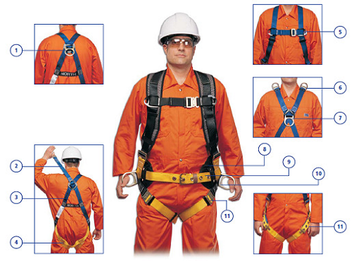 1、墜落防護(hù)連接點(diǎn)。2、D形環(huán)延長帶。3、向上箭頭指示。4、腿帶。5、胸帶。6、肩部D形環(huán)。7、胸部D形環(huán)。8、腰部支撐。9、腰帶。10、側(cè)面D形環(huán)。11、腿部連接。