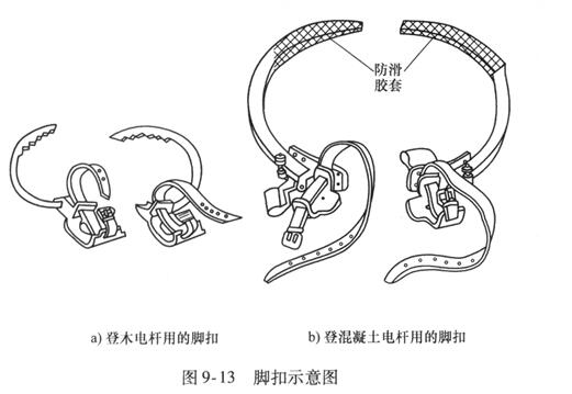 腳扣又稱鐵腳,是電工攀登電桿的主要工具。腳扣分兩種:一種扣環(huán)上帶有鐵齒,供登木桿用;另一種在扣環(huán)上裹有橡膠,供登混凝土桿用。腳扣的結(jié)構(gòu)如圖9 - 13所示,用腳扣攀登電桿具有速度快、登桿方法簡便等特點(diǎn)。
