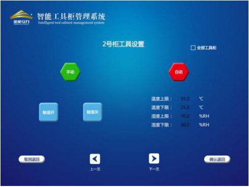 主頁(yè)數(shù)據(jù)顯示界面主要顯示的是各個(gè)柜子工具信息,包括柜內(nèi)、外溫濕度、工具名稱、配備數(shù)量、距檢天數(shù)、在位數(shù)量、在位情況等信息。編號(hào)圖標(biāo)顯示紅色則表示離位,綠色則表示在位。上下頁(yè)按鈕可進(jìn)行各柜子頁(yè)面切換。該界面還配有開門、設(shè)置、查詢界面的按鈕。狀態(tài)一欄有自動(dòng)、手動(dòng)兩種狀態(tài),表示的是此號(hào)柜中除濕機(jī)的工作狀態(tài)。自動(dòng)狀態(tài)下,當(dāng)溫、濕度達(dá)到設(shè)定的范圍值則除濕機(jī)會(huì)自動(dòng)打開或者關(guān)閉。手動(dòng)狀態(tài)下,可以強(qiáng)制打開或者關(guān)閉除濕機(jī)。