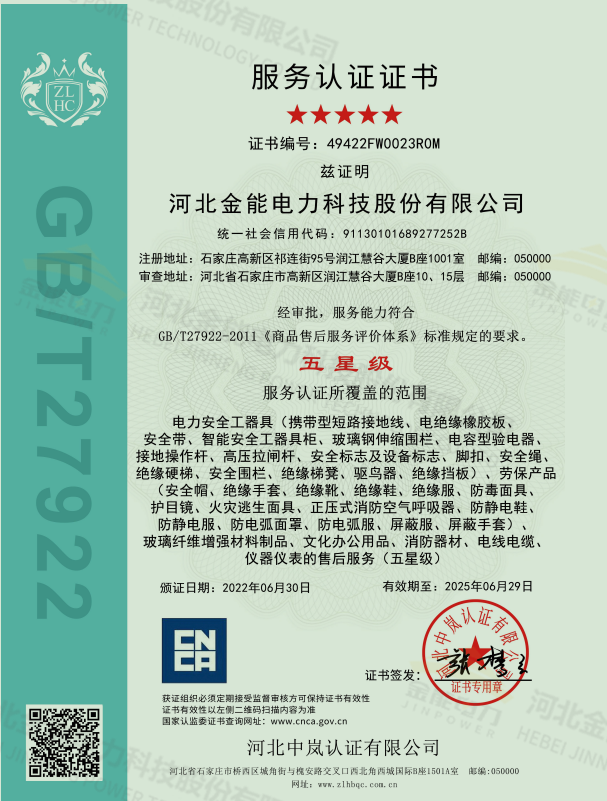 金能電力榮獲五星級(jí)服務(wù)認(rèn)證證書